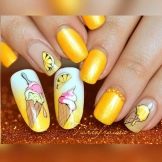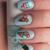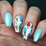 Today, this design remains one of the most popular options for summer manicure. In the summer, it became fashionable to combine manicure with ice cream with moonlight and classic French manicure. The combination of ice cream with images of other desserts: cupcakes, donuts, cocktails with straws is also very popular. For long nails, an option with many small ice cream cones has become popular, which creates the feeling of a printed print or wallpaper on the nails.