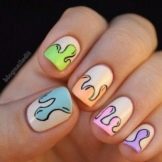 A swirl manicure-ice cream broke into fashion in the spring of 2015. During this period, they mainly drew one ice-cream cone on the ring finger, while the rest of the nails were covered with a plain bright varnish. This idea was not only not forgotten next summer, but also acquired several new options for execution. So, for example, there were designs with ice cream on a stick, melting ice cream and manicure-ice cream, in which the entire nail from the base to the tip is painted for your favorite summer dessert.