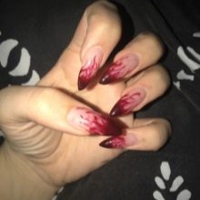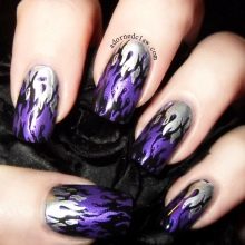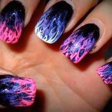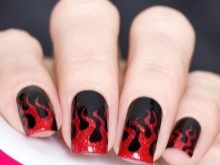 - The most common symbols of fiery manicure are flames, sparks, drawing a bonfire. For the background, varnish of dark red, black, burgundy color is applied. Further, elements of flame are drawn in lighter colors. The yellow-orange fiery silhouette on a black background looks especially impressive.