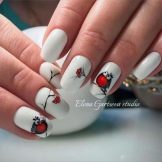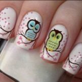 Birds may not necessarily symbolize the gentle and free nature of a woman. Now the trend is funny funny owls with expressive eyes. This manicure is also good because it is quite easy to draw, and even a novice master will be able to cope with the image of a large bug-eyed owlet. Birds can be made in any color, but it is better to make them contrast with the background. It is recommended to apply one or two nails for drawing a picture. Another fun option is the Angry Birds. In this case, you can use all five nails. More often the background is chosen in blue and blue tones; multicolored muzzles of birds look beautiful on a white or natural surface.