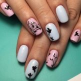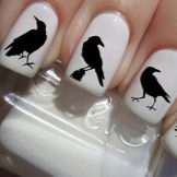 For more modest ladies who usually prefer a classic jacket in manicure, several design options are also offered. For example, the dark silhouettes of night birds in combination with a black jacket look very mysterious. It will be a modest, unusual design, but it will immediately be clear to those around that the bearer of such a manicure is a woman with a very refined taste. If you dilute the monophonic coating with a couple of pigeons pressed against each other, then this also will not give the manicure vulgarity and expressiveness, but only emphasize the romantic mood in the girl’s soul.