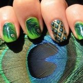 An interesting design option is the image of the bird's head on the little finger and its body and feathers located in the correct projection on the remaining nails. So the whole picture will turn out. By the way, for supporters of a calmer and more delicate manicure, the image of feathers of nude shades is allowed. The biscuit nails look very sophisticated: if one of them is covered with the “coffee with milk” color and the neat feather is drawn, it will look very elegant and intelligent.