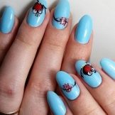 As a rule, this option is performed in blue and white colors. For example, you can cover all nails with the color of a sea wave, and on one of your fingers draw a white sail and white “ticks” of seagulls flying from above. You can distribute this pattern on different nails. A golden starfish on one of the nails will add originality to this design. With such a manicure, you can safely go on a sea cruise.