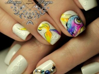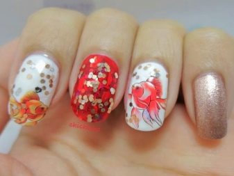 In addition to these options, there is also another design of marigolds with fish: with sequins and medium-sized rhinestones. In addition, even in the finished drawing, each master can bring something of their own, making nail design a real masterpiece, which will undoubtedly raise the mood of its owner and make others pay attention to it.