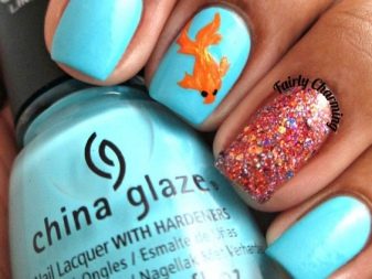 Gold, however, like any other fish, it is difficult to imagine without the sea, therefore, in the manicure there are a variety of marine shades: from turquoise to dark blue and even black. Also relevant are all manifestations of yellow, green, white, blue. Among the primary colors must be golden. However, the glitter of gold on fish scales can be replaced with rhinestones, sequins and other additional components.