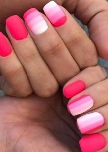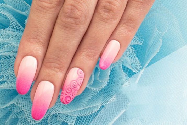 The gradient look of manicure gives endless scope for creativity. Masters create a lot of interesting transitions, using pink varnish colors in the work, as well as a palette contrasting or close in hue.