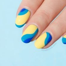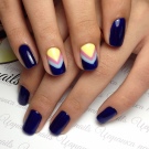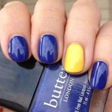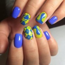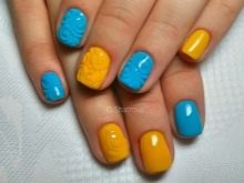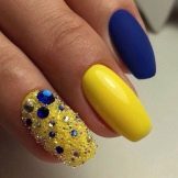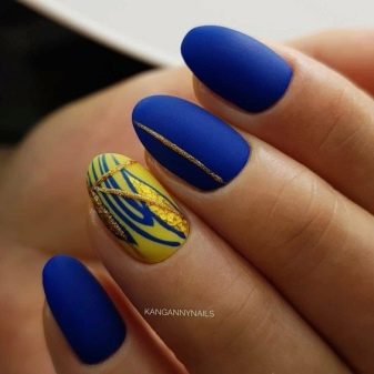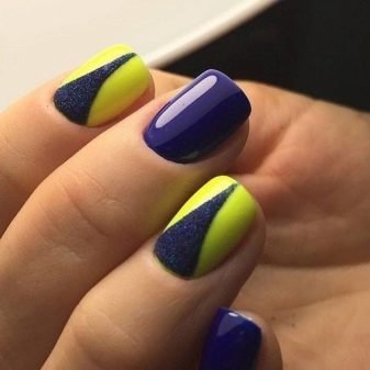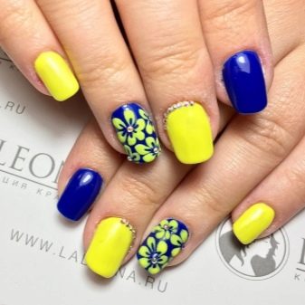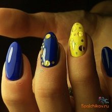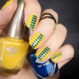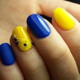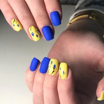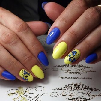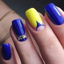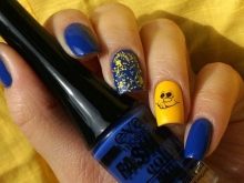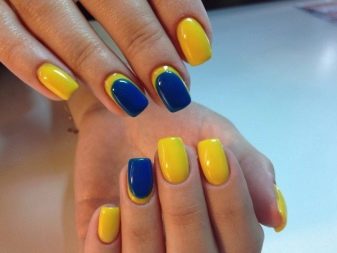 The contrast of colors is extremely sharp and noticeable, but, despite this, you can make an incredibly soft and calm manicure that will look attractive with both a dress and a formal suit. To make this option successful, you should use muted shades of two colors. If a girl wants to make a manicure with brighter shades, she should bet on blue, leaving yellow as an interesting accent.