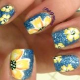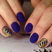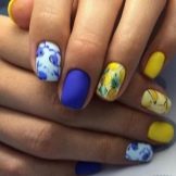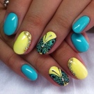 If the goal is to create a cheerful, summer mood, then yellow should be the main color in the design of manicure. Blue will emphasize the bright, warm shade of its "neighbor." The summer version allows the girl to add a variety of decorative elements and unusual patterns. But only young fashionistas can afford a large amount of decor, since older women should use a minimum of jewelry for nails.