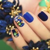 To make the manicure more solemn, shiny blue rhinestones are added to the yellow background.