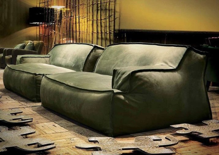 In the production of frameless sofas, different raw materials are used. Upholstery materials are distinguished by their dense structure and breathable properties. Most often, materials such as velor, jacquard, chenille, tapestry, flock, suede are used in the work. Less commonly, frameless sofas are made of artificial leather. The inner covers are made of elastic textile based on cotton.