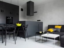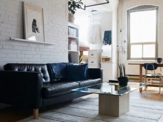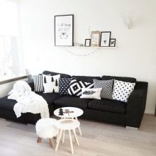 - Minimalism. A small black sofa will complement furniture items of the same color. But then the curtains, carpet or any accessory should be in a contrasting color.