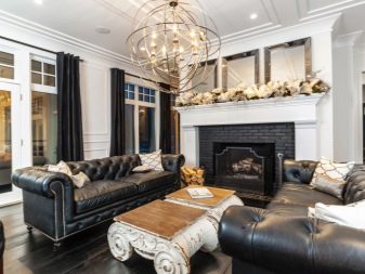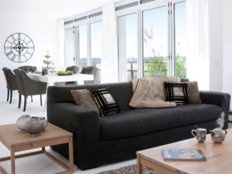 - Other elements of furniture. In contrast to such a sofa, a white table with chairs or a chest of drawers can be located nearby. And if a black cabinet or a slide is attached to the black sofa, it is imperative to supplement the interior with a light trunk and curtains.