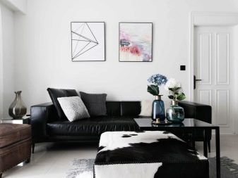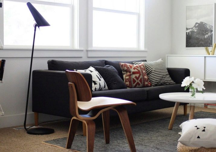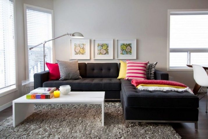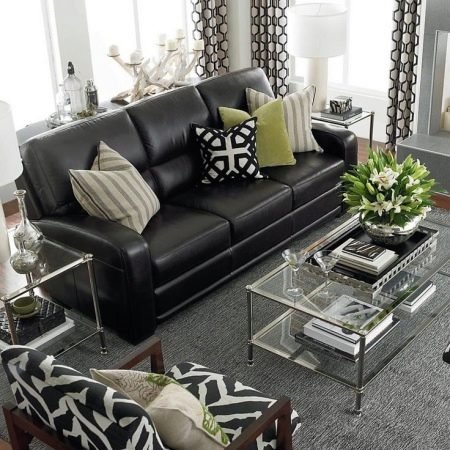 - Other accessories. Stylish paintings or photo frames on the walls will complement the black sofa. Original lighting fixtures will also be in place. And, of course, do not forget about rugs and pillows. They can become a bright accent. Out of place in a room with a black sofa will be flowers, a mini fountain or an aquarium.