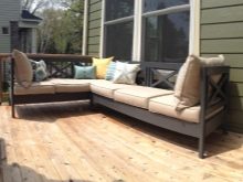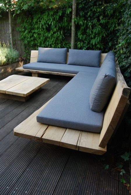 A wooden corner sofa made of rough unpainted boards, combined with a small table can become an adornment of any garden plot, and soft pillows not only make the rest comfortable, but also help to harmoniously fit it into the interior.
