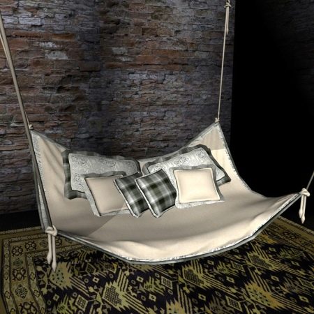 - Sofa hammock - An unusual, but very popular design, which has a wide design range and can be mounted both between trees and on special supports. Basis - burlap, polyester, cotton.