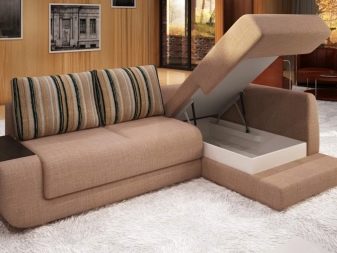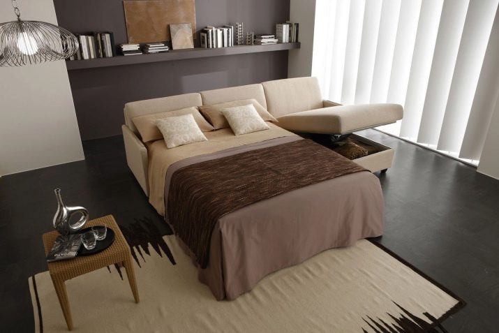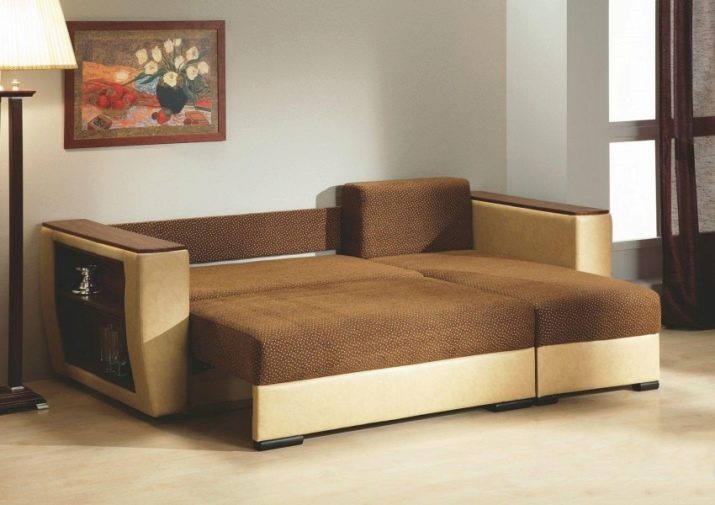 - Well established and withdrawable structures with a dolphin transformation mechanism, which is most often installed on corner models. Advantages of furniture - convenient use, availability of a linen box and compactness, disadvantages - high price, low-quality wood frames serve a short time.