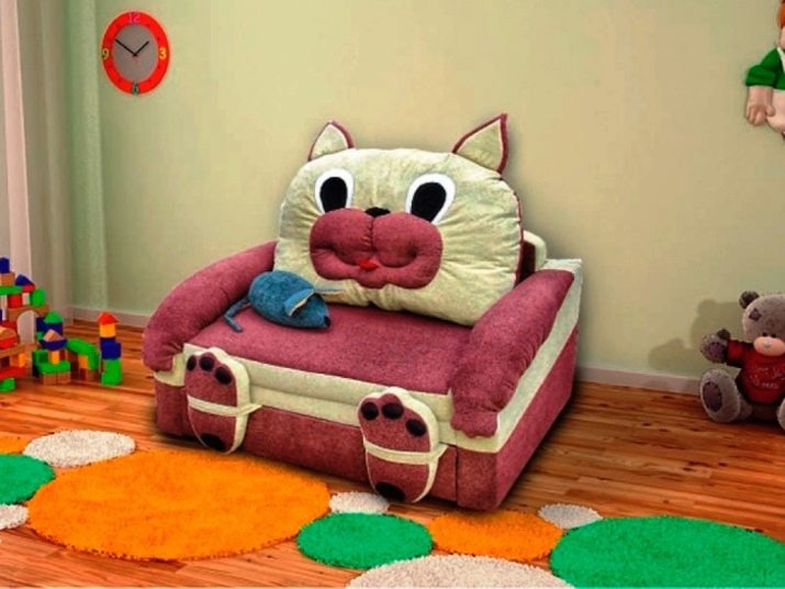 For children, furniture with upholstery from chenille or flock will be an excellent choice.To give the interior a contrast, you should give preference to mini-sofas with images of animals or characters of fairy tales.