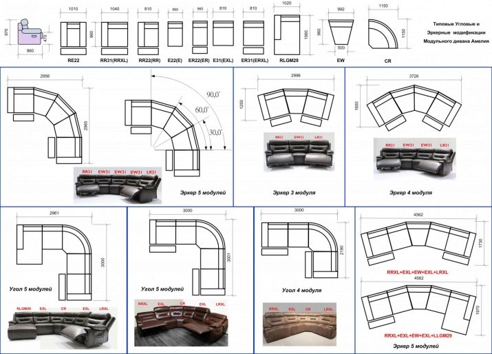 The average height of the models varies between 85-95 cm (along with the back). The total width of products from several sections can be 384, 340, 440 cm. In depth, sofas can reach 129-143-150 cm. Corner modifications can have different lengths of sections, for example, most of it can be 3-3.2 m and the smaller one is about 1-1.2 m.