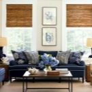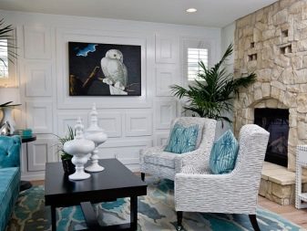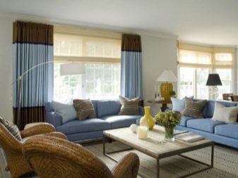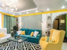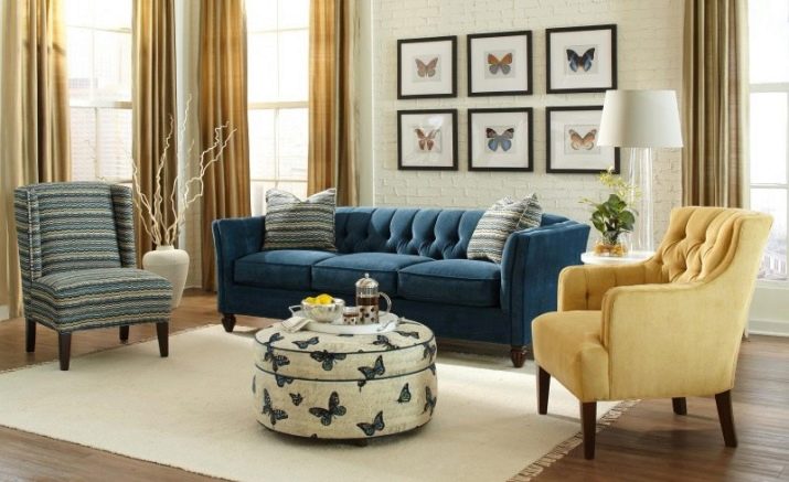 It is important that there are no more than 3 colors in this design, and the third should be combined with the decor in the room. If you choose 3 elements of different colors, then it is worth considering the rule of their layout. One object can be bright, and the second should be the link between the rest. So, a blue sofa with a yellow ornament on it can be combined with a white armchair and a yellow armchair, on which there will be blue pillows or a blue pattern.