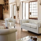 - Voluminous 2-seater sofas and a white armchair will look gorgeous in a room where there is a pistachio or brown shade on the walls. A contrasting combination will be even more interesting if complemented by a dark wooden coffee table. An elegant rug with contrasting patterns can be placed between the sofas.