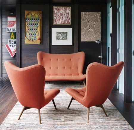 - If you are a lover of daring and bold color combinations, then you should pay attention the combination of black and orange colors. For example, in a room with dark (almost black) wooden trim, an orange sofa and armchairs on high wooden legs will stand out brightly. The floor can also be finished with dark material, but upholstered furniture should be placed on a light carpet or in a separate insert made of milk-colored laminate (parquet).