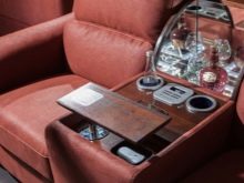 - armrest with a wide range of functions: compact retractable table, stand for glasses with cooling and lighting;