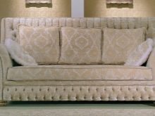 An elegant straight sofa is ideal for classic decorative areas. The first thing that this model attracts attention with sophisticated shapes and a pleasant color scheme. As the main color, the designers chose a light beige, cream tone and complemented it with elegant gold patterns.