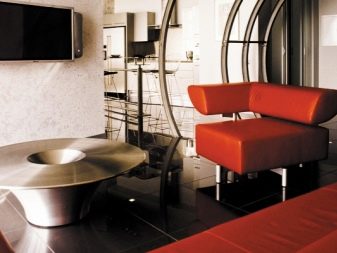 Simple-shaped furniture will fit into industrial loft style. The roomy, round red sofa harmoniously complements the innovative high-tech design.A large straight line can be placed in the study or in the dining area of the living room.