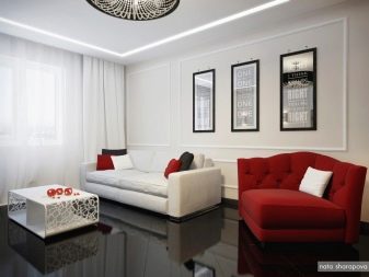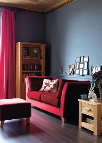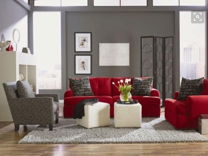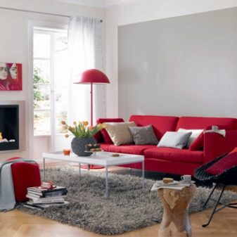 Red sofa is quite appropriate in gray design. This combination is more suitable for minimalism or high-tech style. Gray can be wall, floor or ceiling decoration. If other bright colors are used in the design of the room, be careful when choosing their number.