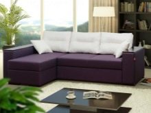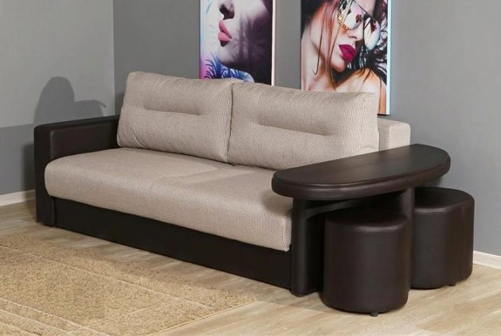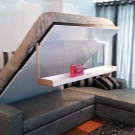 The multifunctional model turns from a sofa into a bed in different ways. The assembled furniture ensemble is a wall-cabinet with open and closed shelves, a cantilever tabletop, a sofa and a compact chair (table). Its countertop can be used as a desk and desk. You can place a lamp on it, however, some models already have a built-in spotlight type.