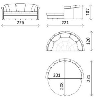 Sectional type analogs consist of blocks for various purposes, and therefore can have modules of different lengths and widths. For example, the average length of the ottoman is 180 cm. The sizes of round sofa beds can be 226 cm in length, along with armrests with a width from the protruding edge of the back to the middle of the circle 220 cm. Moreover, the length of a full bed for such models is on average 210 cm Other versions have a circle radius of 125 cm.