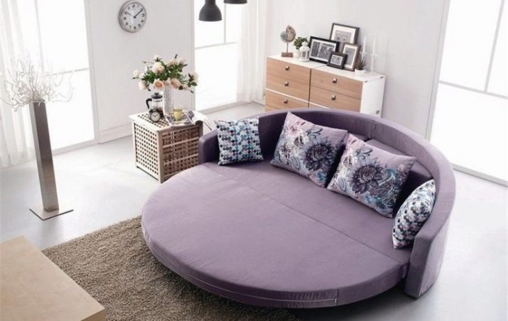 - Round lilac sofa bed, chosen to design a spacious living room.
