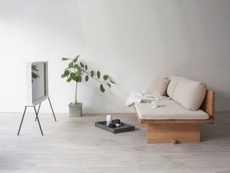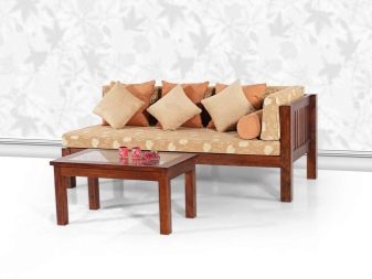 For the manufacture of carcass sofas, natural wood, wood-shaving and wood-fiber boards, metal and plastic are used. Models from the array are much more expensive than products from extruded plates and are characterized by high strength, presentable appearance and long life. The conditional disadvantages of wooden couches include high weight and high cost.