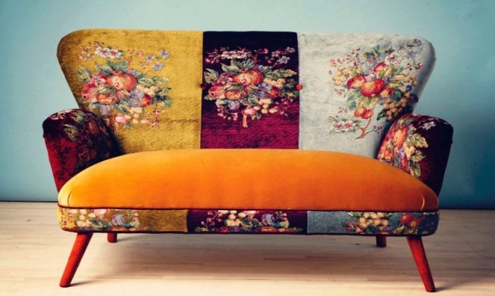 Upholstered couches made of expensive and moody materials, such as velvet and velor, often purchased for decorative purposes to decorate rooms decorated in retro styles.