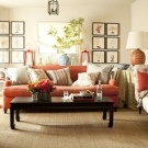 When decorating a living room with a warm orange sofa, laminate or linoleum will look beautiful as a floor finish.To create an ethnic style, choose earthy wall decoration and do not forget to arrange figures from wood, leather and other natural materials.