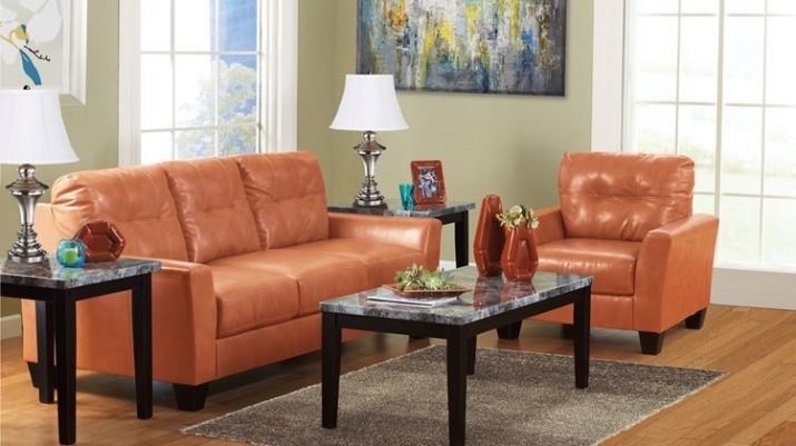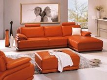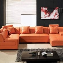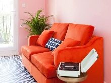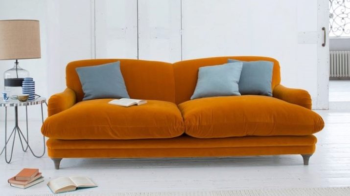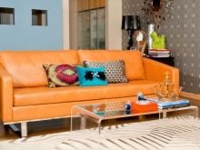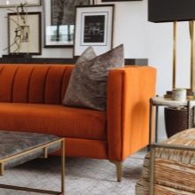 Sofas may also differ in upholstery material. So, often orange furniture is executed from genuine leather. This option will look good, for example, in the art deco or modern style. If the product will be used as a berth, it is better to choose as an upholstery velor, tapestry, chenille.