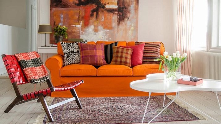 Generally The tandem of orange and white is a classic, but do not be afraid to combine three colors at once. So, to this pair of colors it will be appropriate to add a green or pink tint. If the sofa is made in too bright a color, you can dilute this flashy tone with black and white pillows. A floral motif will not hurt on such pillows.