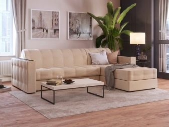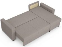- Corner sofa Ergonomic dream has a milky beige upholstery. This fabric is durable and durable, and also well cleansed.The color scheme is diverse, to order you can choose any other shade of furniture. The sofa has an accordion mechanism, which makes its transformation easy and comfortable. The armrests are made of countertops. A box for storing linen is located under the berth. The angle can be located both on the right and on the left side.