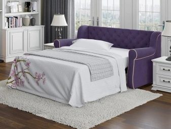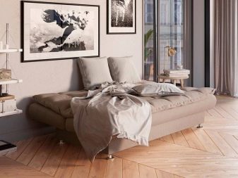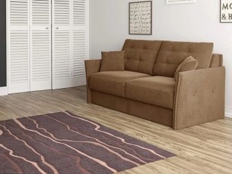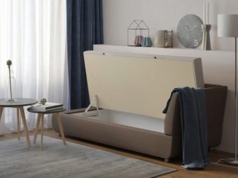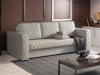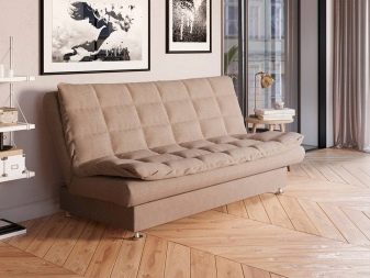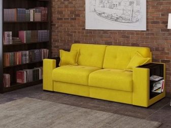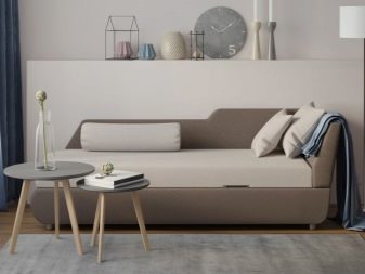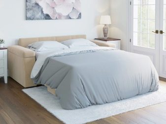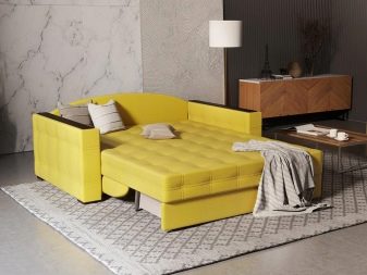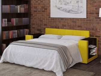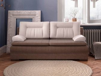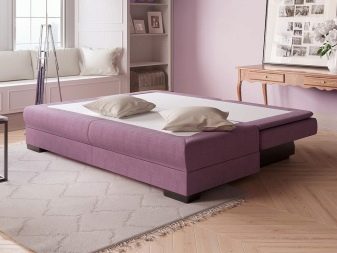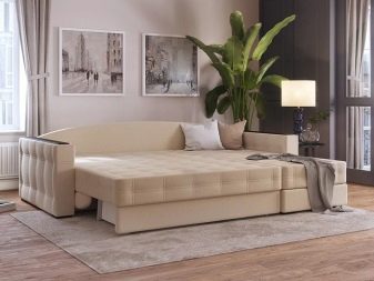 - Life Models They are sofas with useful functions that contribute to a comfortable rest. They have armrests with integrated small shelves. Unfolded, the sofa measures 2.14 by 2 meters. Under it there is a capacious box for linen. The armrests also have niches for items or pillows. The headrest is fixed in three positions and is adjusted for the growth of a person. The kit includes two decorative pillows.