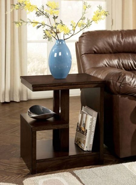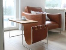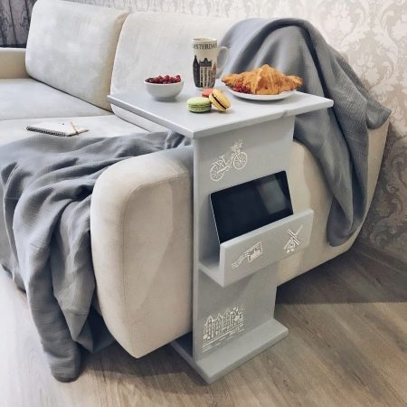 - And here is the cantilever design of a strict form, the expected colors. It is attached to one of the armrests, used as a place where books lie and a lamp stands. Do not put the table close to the sofa, leave a small distance between them.