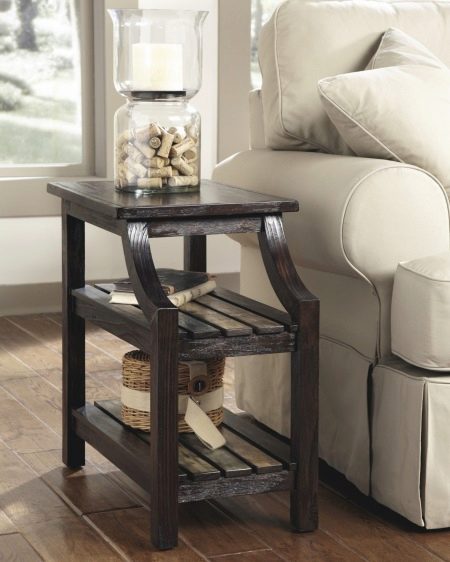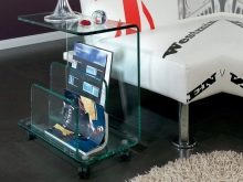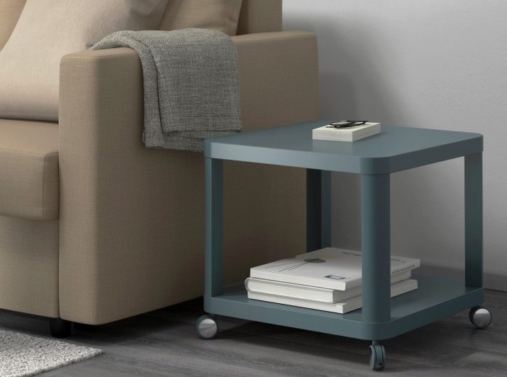 - Attached design on casters. This is the most mobile option that can serve not only the sofa. Books and magazines are stored on the bottom countertop. It can be combined with color with any element of furniture, or it can be a self-sufficient thing.