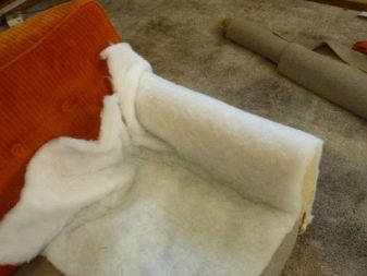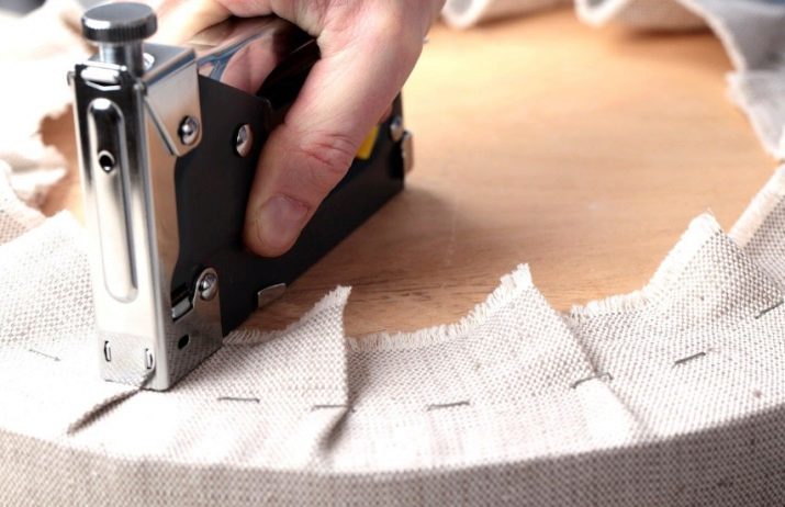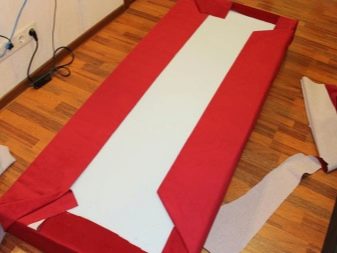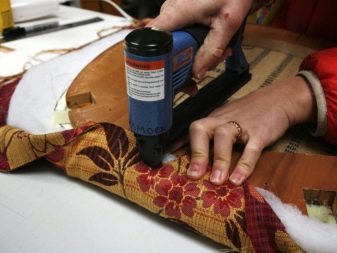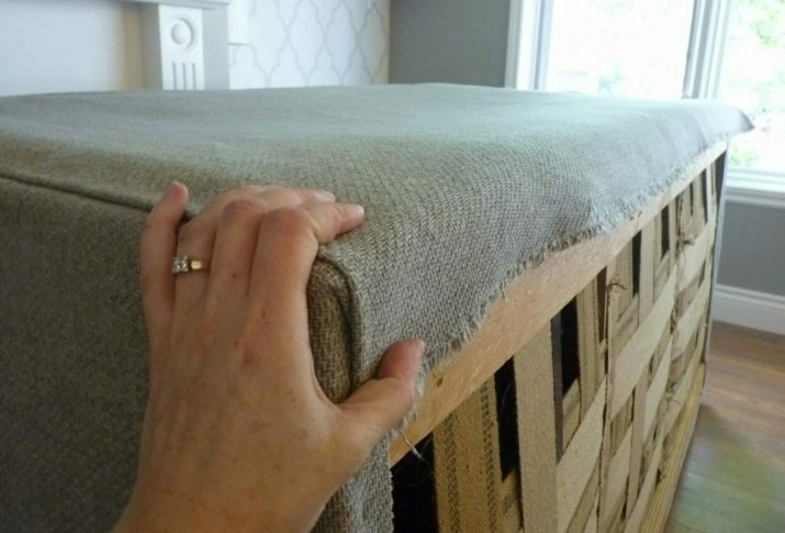The filler is fixed on a wooden frame using a stapler or special furniture glue, after which you should go to the upholstery. The material must be cut taking into account the angles and side protrusions that must be sewn together to make a kind of cover. Then the lower edges of the fabric must be fixed on the lower part of the wooden frame using the same furniture stapler.