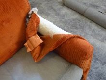 Remember to leave allowances. If you sew a case yourself, you will need a good sewing machine with an overlock. If not, you will have to consult a specialist. Before fastening, stitched covers necessarily need fitting. It is possible that at this stage it turns out that they will have to be cut or sutured.The upholstery is fixed to the frame using a furniture stapler with staples. The standard spacing between staples is 40-45 cm.