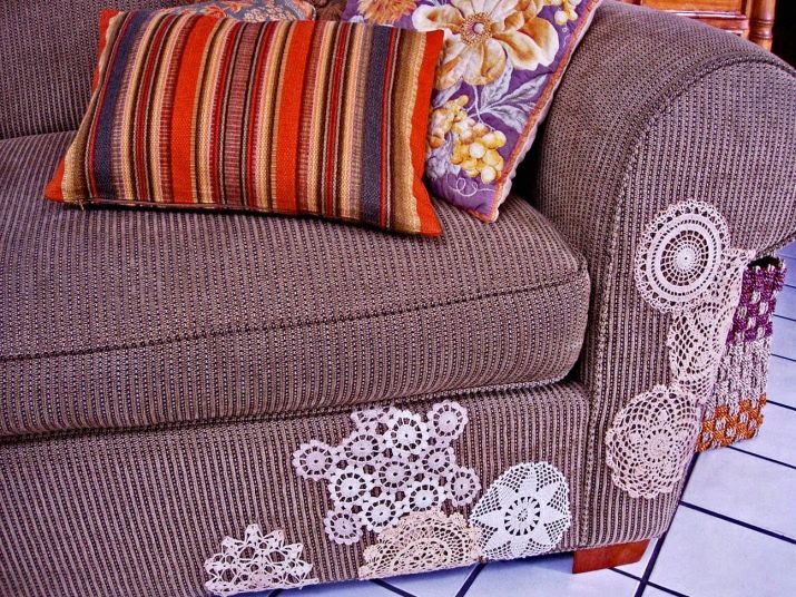There is another type of decoration - when the restoration of furniture is minimal, it involves only minor manipulations. For example, a corner is still frayed in a fully operational sofa. In this case, art patches help out. It can be knitted elements, which openwork mesh, pattern pass through the furniture - it seems that it could look so from the very beginning.