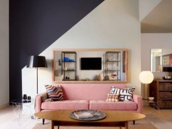 If your goal is to emphasize the pink sofa, include light window textiles in pastel colors, a delicate shade wallpaper, finely printed. Furniture is selected depending on the shade: light furniture combines well with pale pink tones, dark - with bright pink.