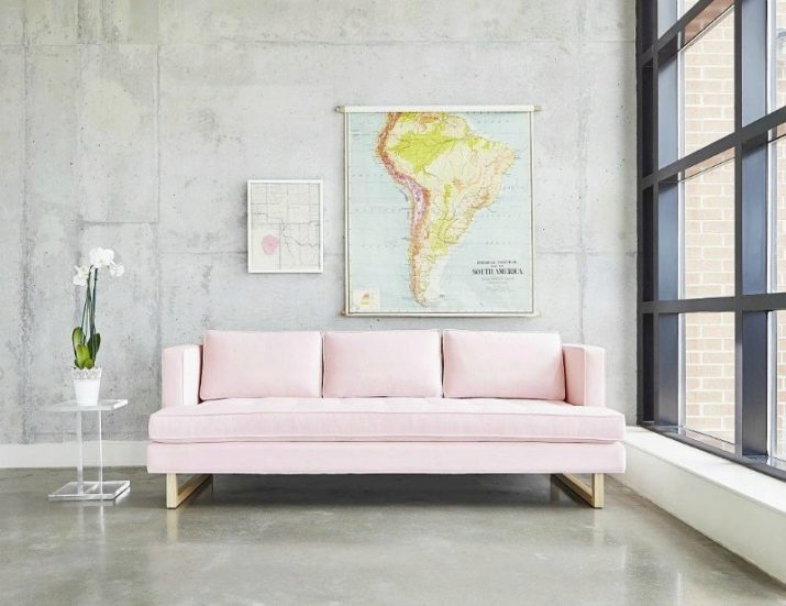 Loft. An unexpected but expressive decision. Brick walls, rough finishes, dark wood will be a great backdrop for a pink sofa. The main gamut should be neutral, then the installation will turn out more catchy.