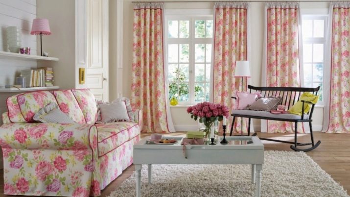Provence, shabby chic, romance. In all these directions there are a lot of ornate elements, carved legs, white. The sofa is optimal light pink. Allowed print, satin gloss. Artificial aging of furniture is one of the touches of shabby chic and provence.