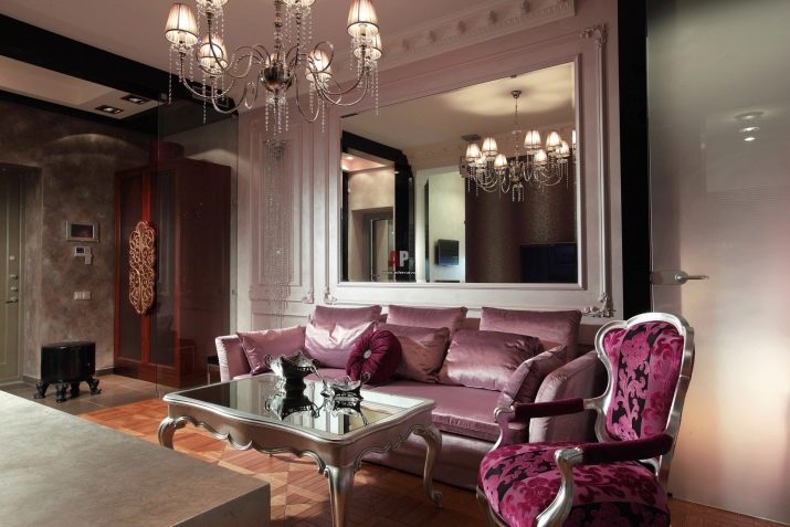 Art Deco. The pink sofa will fit into such an interior very organically. The main thing is that the room should be large enough, high, with a bright ceiling. A large picture on the wall, ivory decor and a chic pink sofa will make together a luxurious composition.