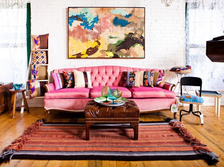 Eclecticism. Flirty shades of the sofa against a completely neutral background are appropriate here. You can hang abstraction paintings on the walls. Cushioned pillows, carpets and textiles are a must.