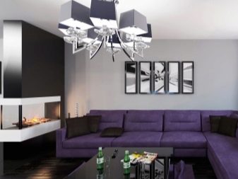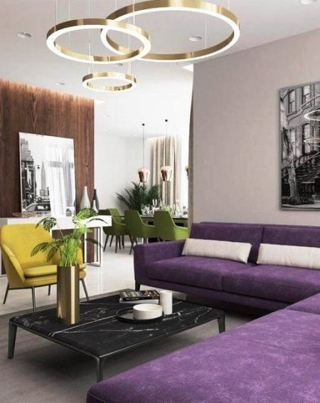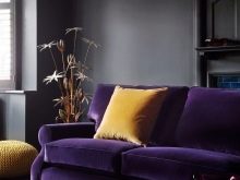 If the decoration of the room is done in gray-white shades, then, in addition to the purple sofa, it is better to use several bright lamps or brighter curtains.